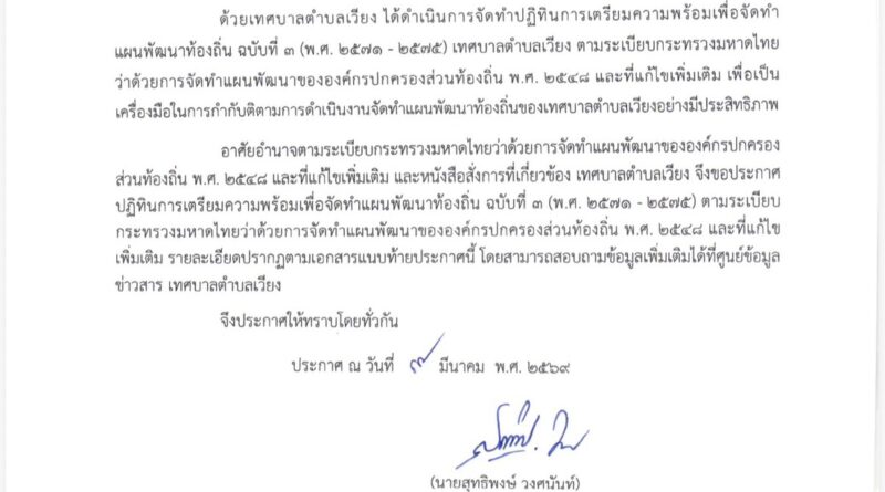 ข่าวประกาศ ข่าวประชาสัมพันธ์ ประกาศเทศบาลตำบลเวียง เรื่อง ปฏิทินการเตรียมความพร้อมเพื่อจัดทำแผนพัฒนาท้องถิ่น ฉบับที่ 3 (พ.ศ.2571 – 2575) 18 มีนาคม 2569 ชนินทร ธรรมศิลป์ อ่านต่อ