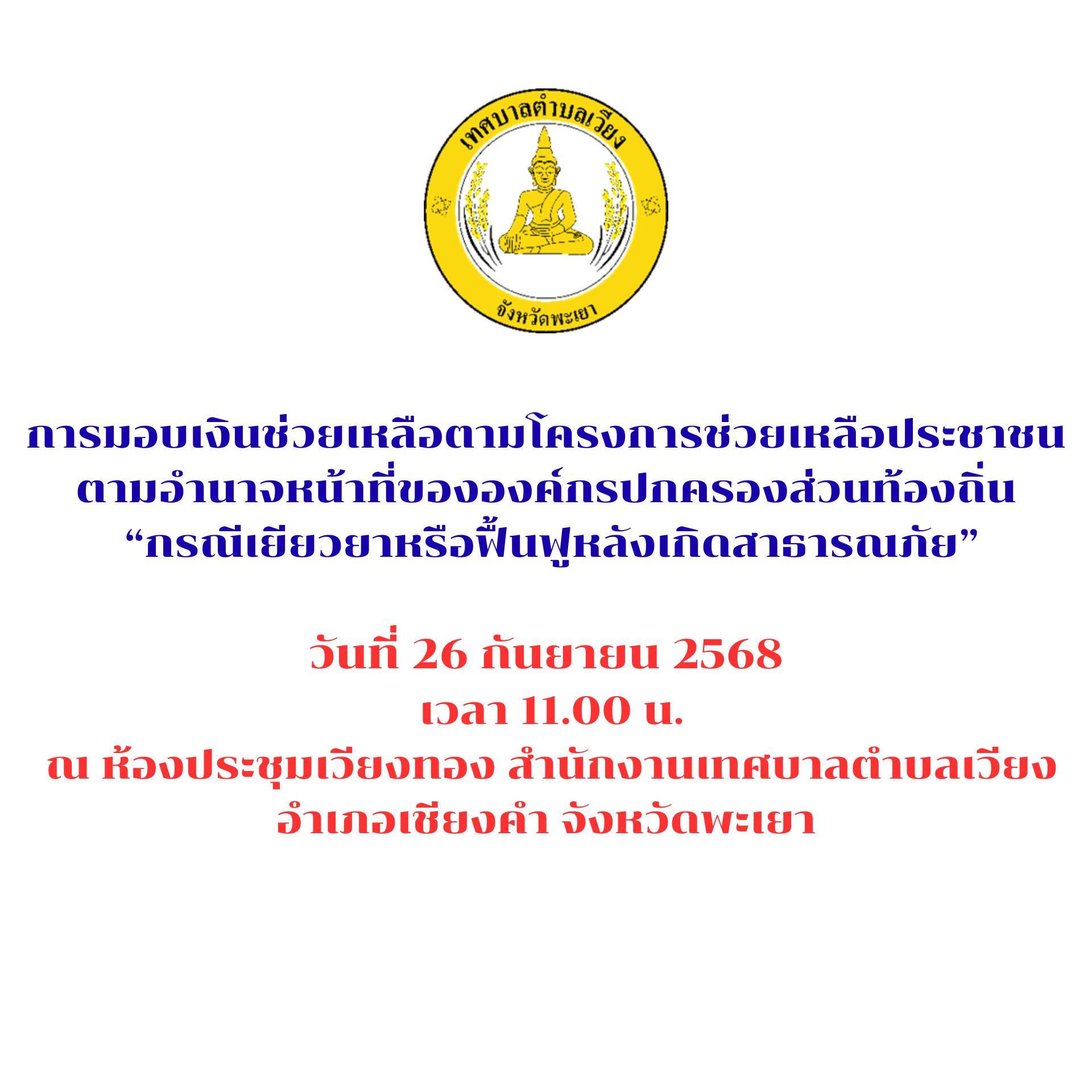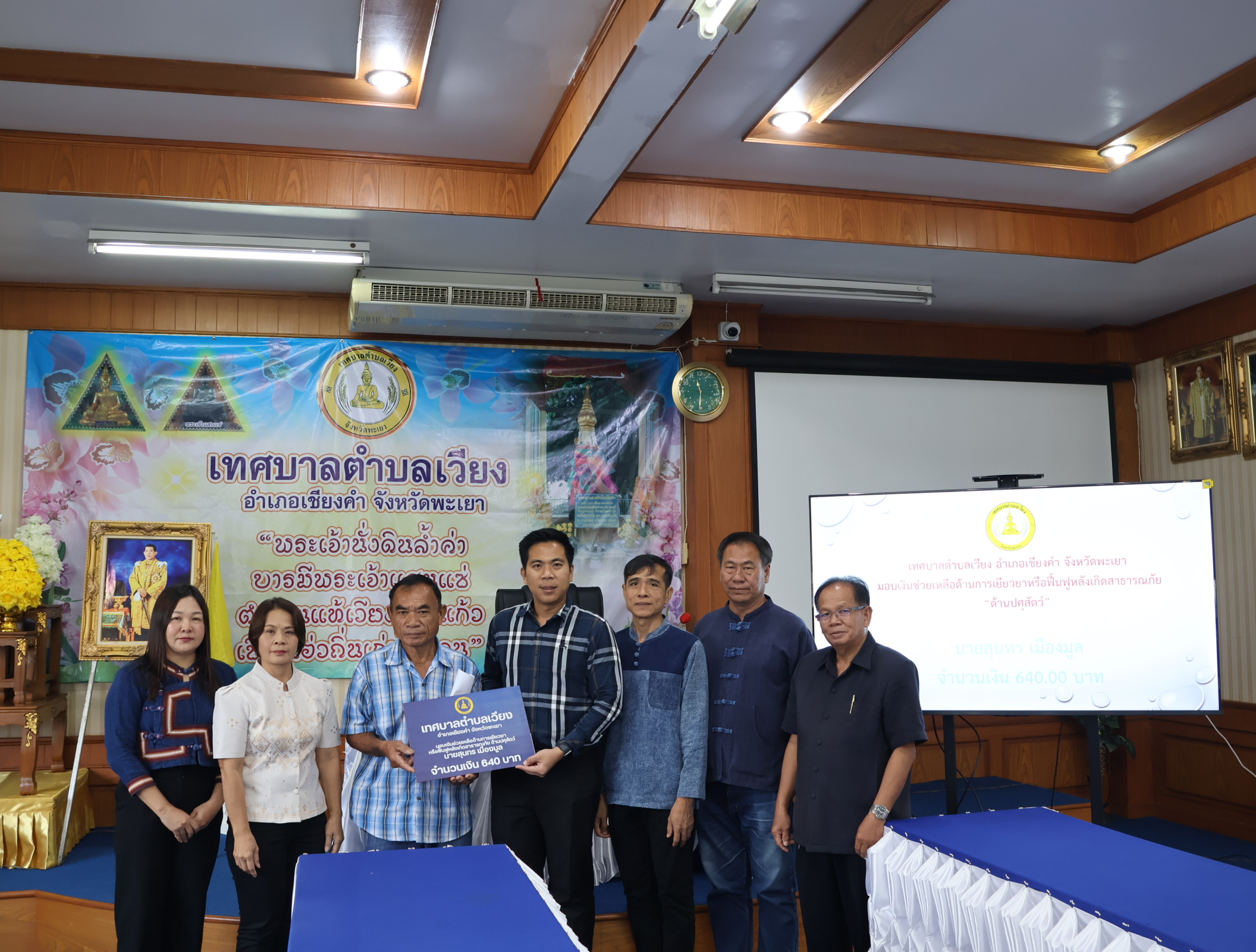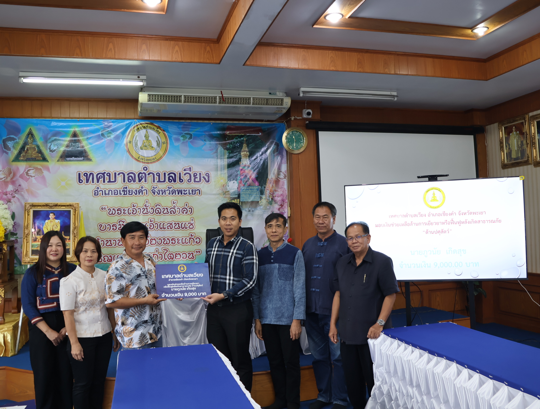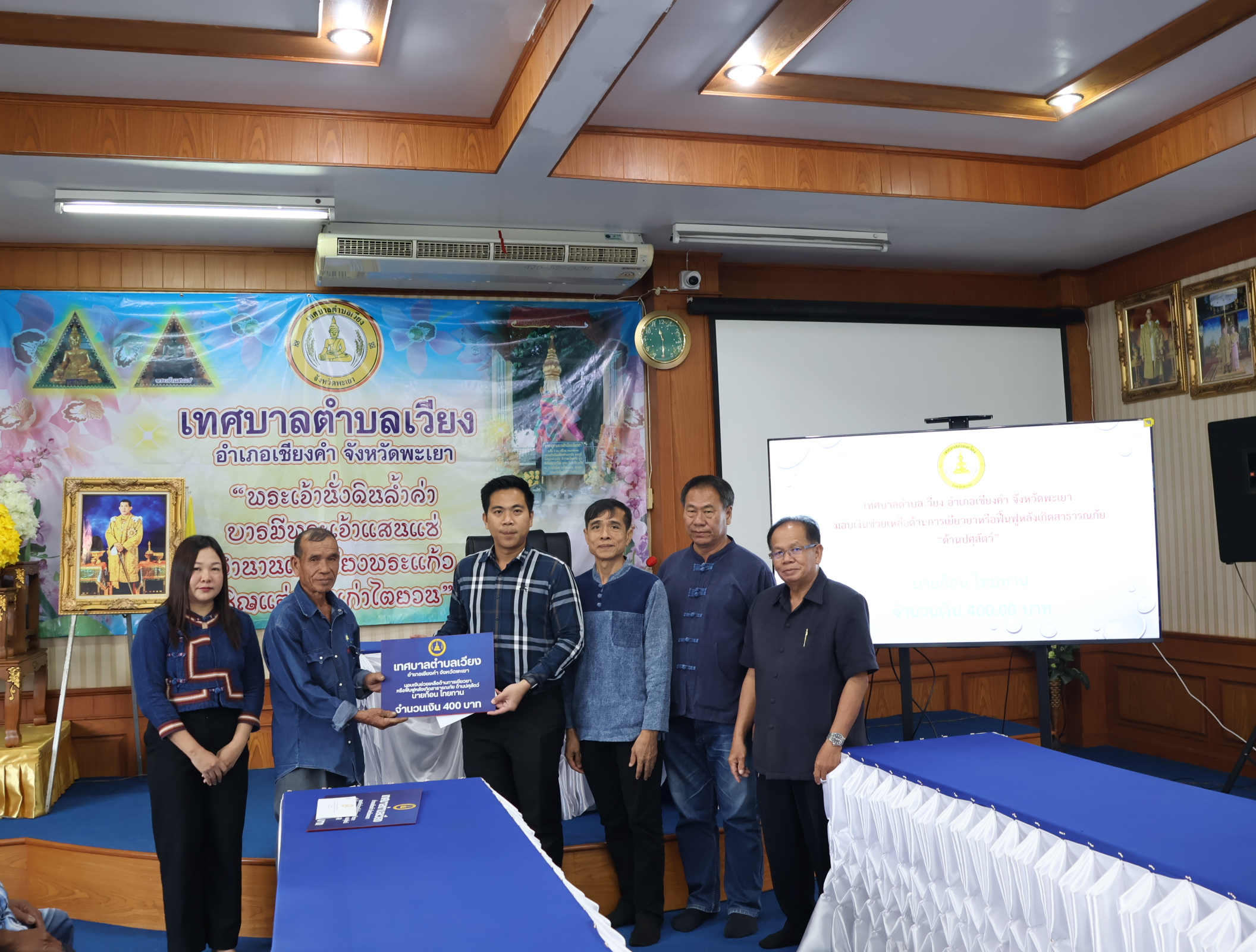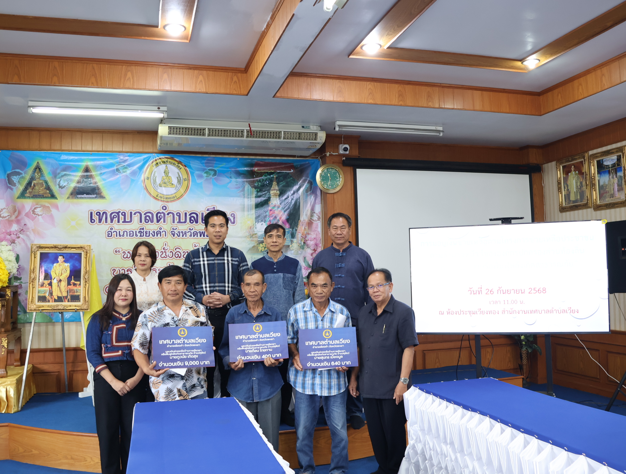 นายสุทธิพงษ์ วงศนันท์ นายกเทศมนตรีตำบลเวียง คณะผู้บริหาร ปลัดเทศบาล และหัวหน้าสำนักปลัดเทศบาล เทศบาลตำบลเวียง มอบเงินช่วยเหลือด้านการเยียวยาหรือฟื้นฟูหลังเกิดสาธารณภัย “ด้านปศุสัตว์” จำนวน 3 ราย ณ ห้องประชุมเวียงทอง สำนักงานเทศบาลตำบลเวียง อำเภอเชียงคำ จังหวัดพะเยา
