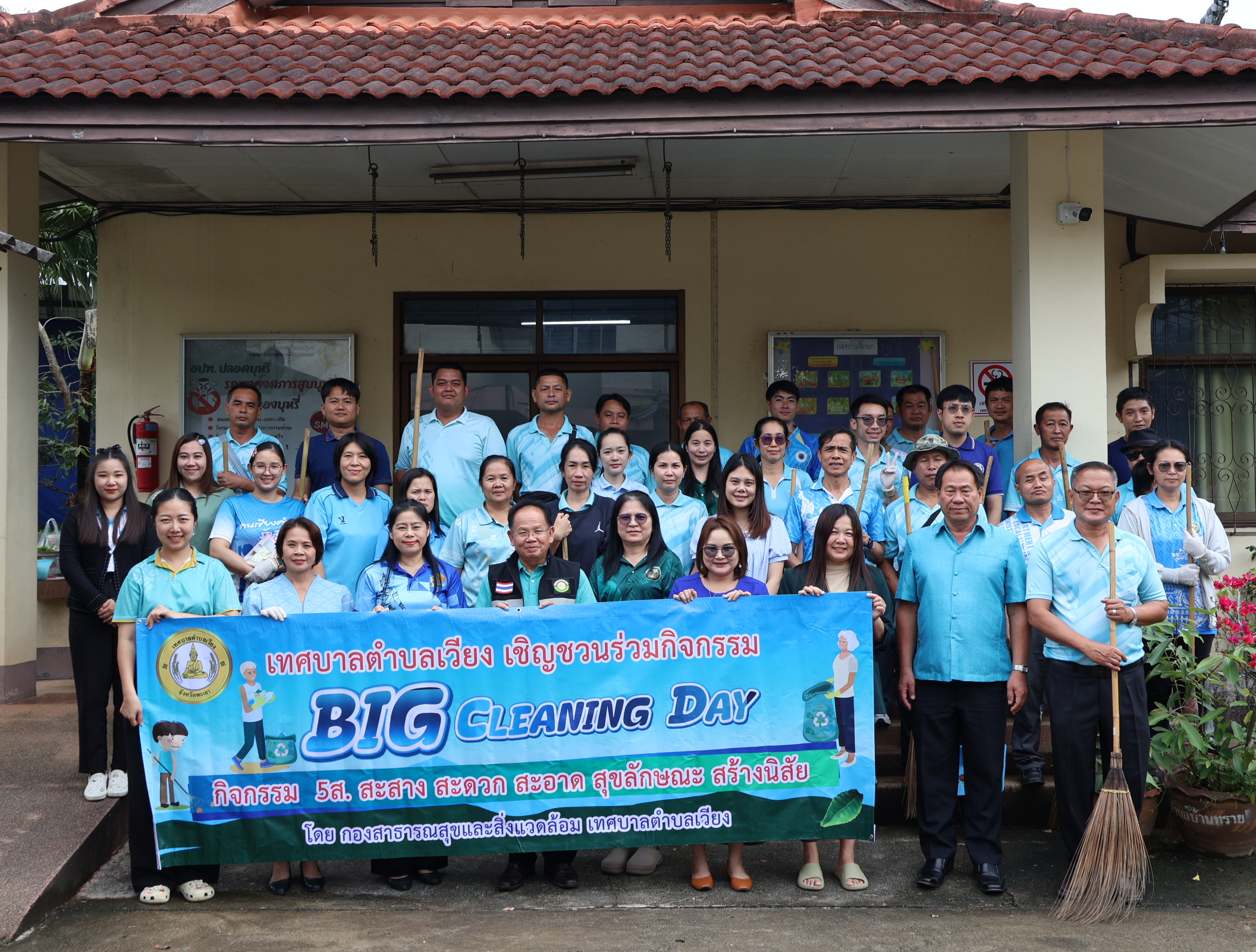 นายสุทธิพงษ์ วงศนันท์ นายกเทศมนตรีตำบลเวียง มอบหมาย นายทอน ใจดี รองนายกเทศมนตรีตำบลเวียง นำคณะผู้บริหาร พร้อมทั้งพนักงานเจ้าหน้าที่เทศบาลตำบลเวียง เข้าร่วมกิจกรรม Big Cleaning Day (5ส. สะสาง สะดวก สะอาด สุขลักษณะ สร้างนิสัย) โดยร่วมกันทำความสะอาด กวาดถนน เก็บขยะ บริเวณถนนในเขตเทศบาลตำบลเวียง และบริเวณโดยรอบอาคารสำนักงาน เพื่อสร้างบรรยากาศและสิ่งแวดล้อมในสถานที่ทำงานให้สะอาด และเป็นระเบียบเรียบร้อย ณ สำนักงานเทศบาลตำบลเวียง อำเภอเชียงคำ จังหวัดพะเยา