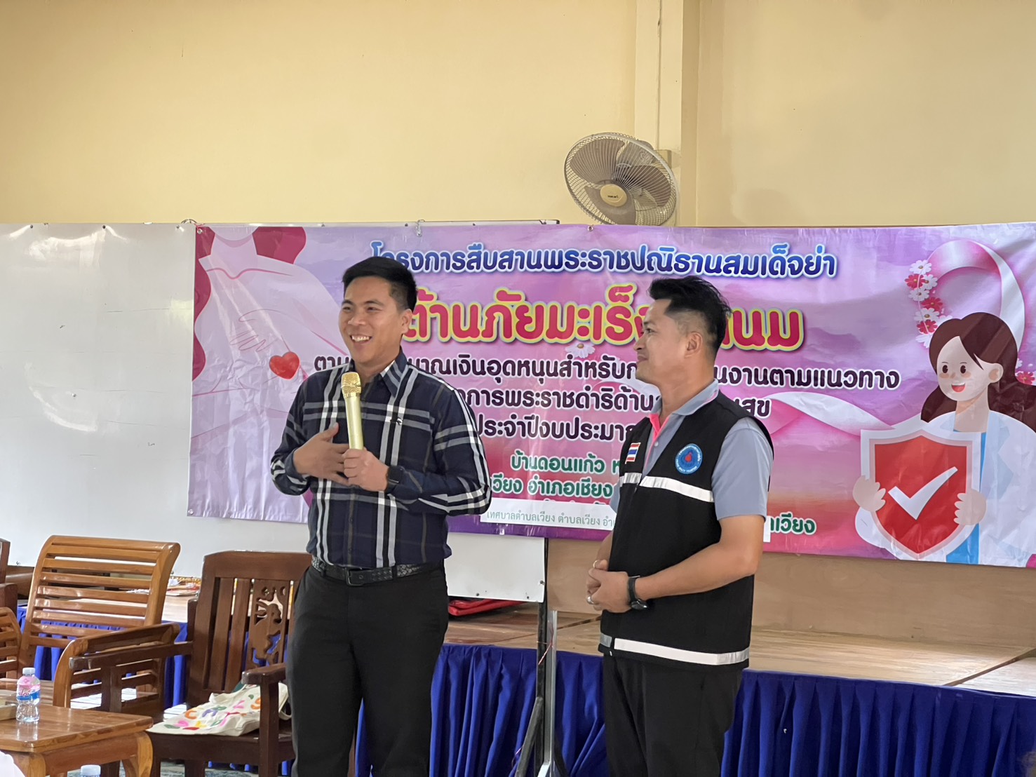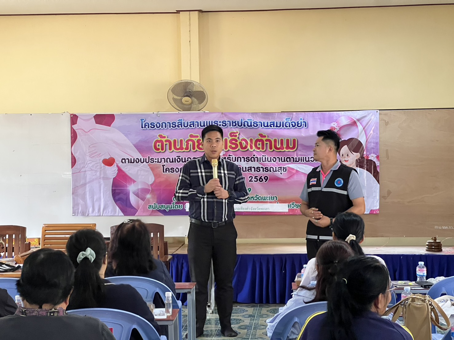 นายสุทธิพงษ์ วงศนันท์ นายกเทศมนตรีตำบลเวียง พร้อมด้วยนายทอน ใจดี รองนายกเทศมนตรีตำบลเวียง และผู้อำนวยการกองสาธารณสุขและสิ่งแวดล้อม เข้าร่วมพิธีเปิดโครงการสืบสานพระราชปณิธานสมเด็จย่า ต้านภัยมะเร็งเต้านม ตามงบประมาณเงินอุดหนุนสำหรับการดำเนินงานตามแนวทางโครงการพระราชดำริด้านสาธารณสุข ประจำปีงบประมาณ 2569 ณ อาคารอเนกประสงค์บ้านดอนแก้ว หมู่ที่ 9 ตำบลเวียง อำเภอเชียงคำ จังหวัดพะเยา