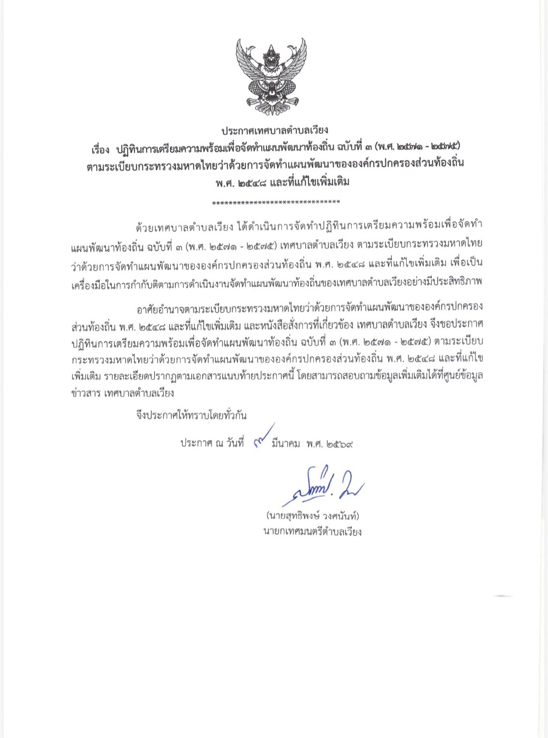 ประกาศเทศบาลตำบลเวียง เรื่อง ปฏิทินการเตรียมความพร้อมเพื่อจัดทำแผนพัฒนาท้องถิ่น ฉบับที่ 3 (พ.ศ.2571 – 2575)