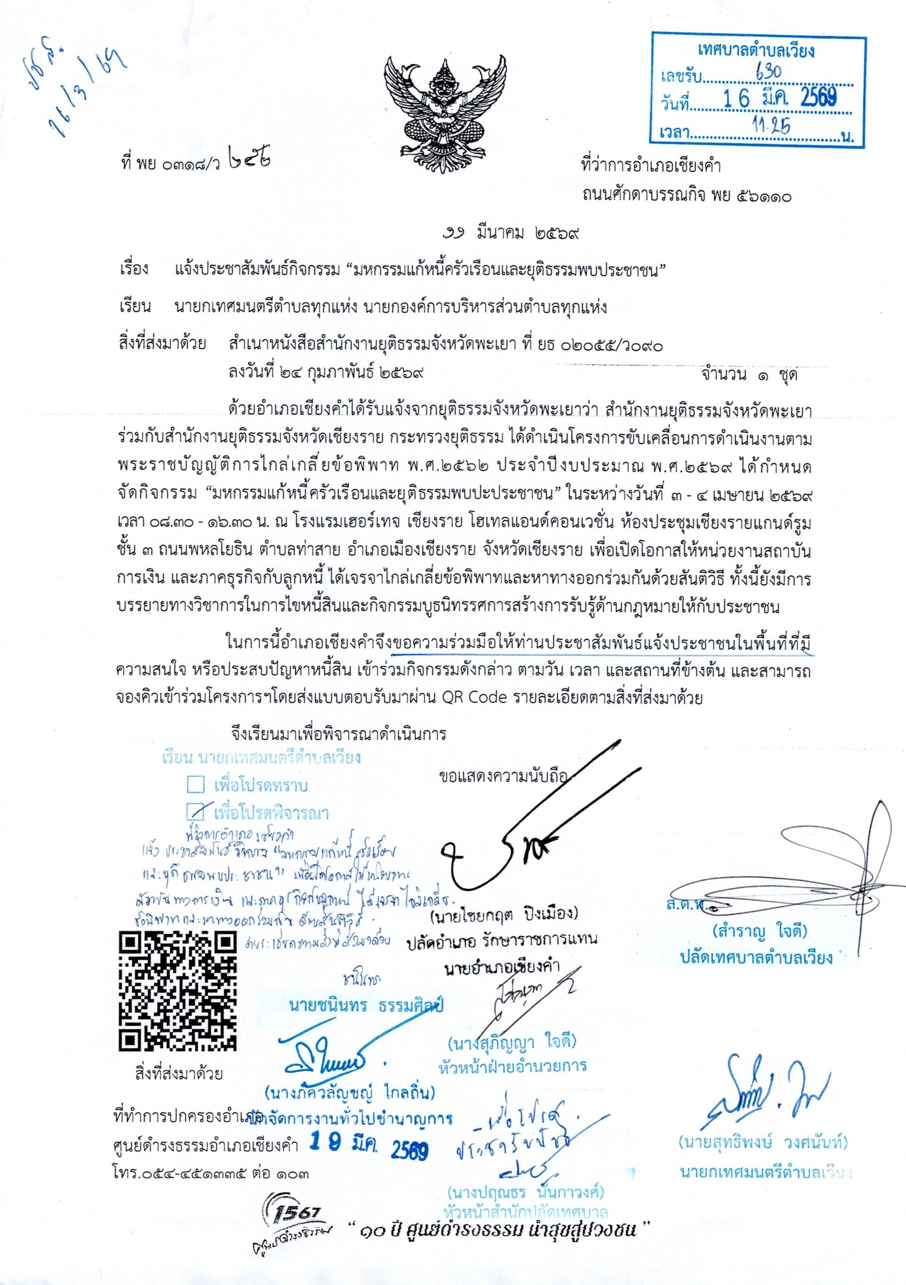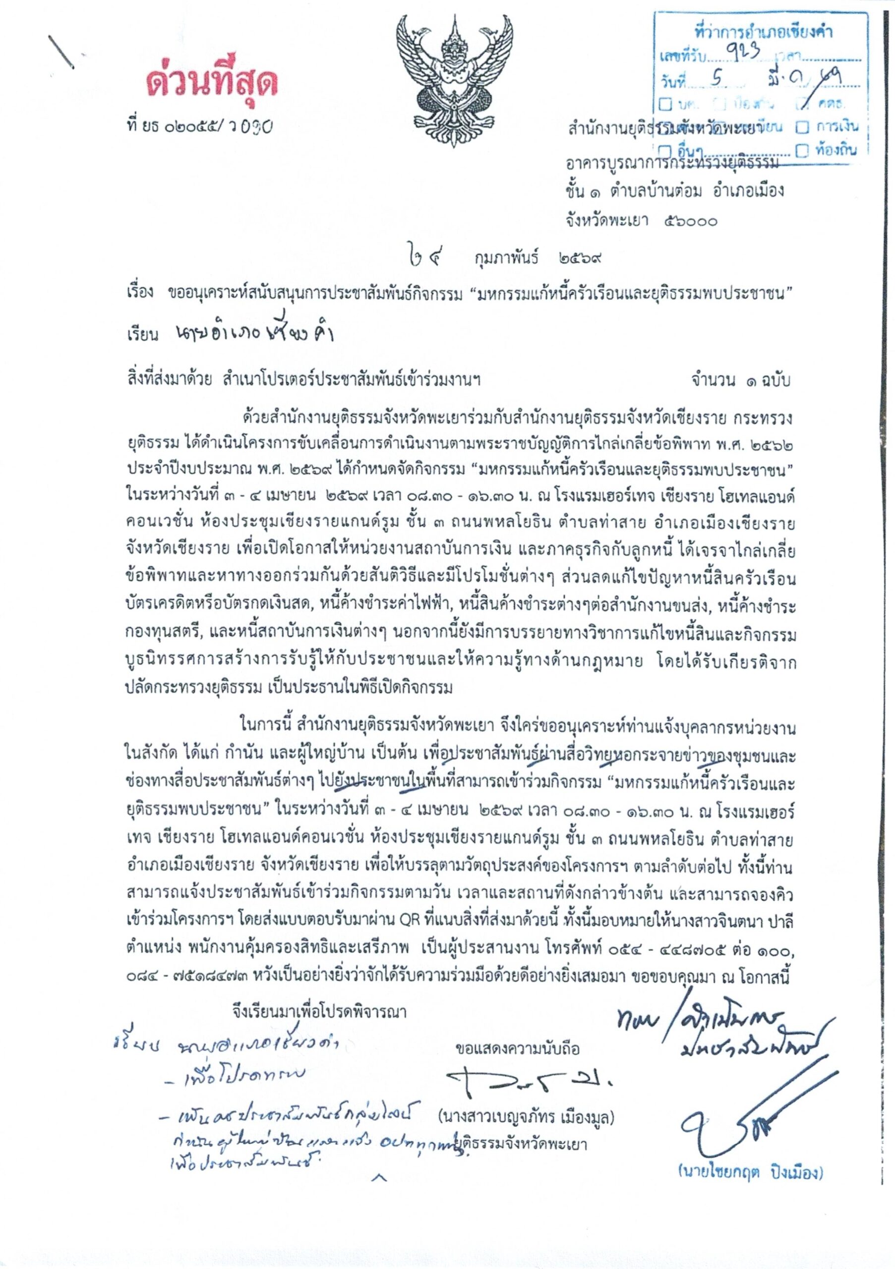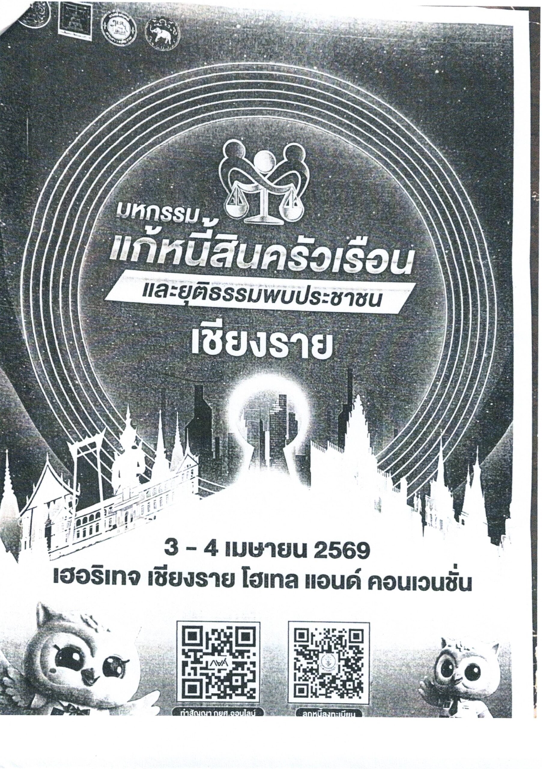 จัดกิจกรรม “มหกรรมแก้หนี้ครัวเรือนและยุติธรรมพบปะประชาชน” ในระหว่างวันที่ 3-4 เมษายน 2569 เวลา 08.30-16.30น. น. ณ โรงแรมเฮอร์เทจ เชียงราย โฮเทลแอนด์คอนเวชั่น ห้องประชุมเชียงรายแกนด์รูม