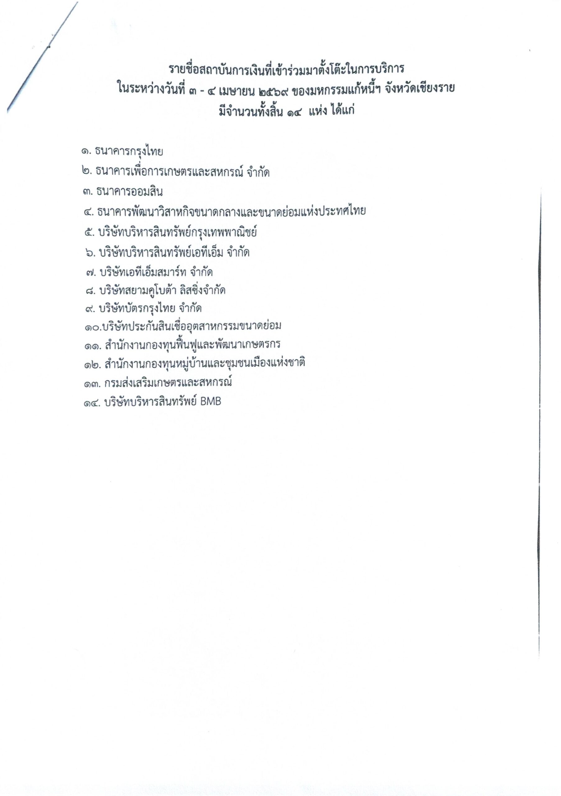 ชั้น 3 ถนนพหลโยธิน ตำบลท่าสาย อำเภอเมืองเชียงราย จังหวัดเชียงราย เพื่อเปิดโอกาสให้หน่วยงานสถาบันการเงิน และภาคธุรกิจกับลูกหนี ได้เจรจาไกล่เกลี่ยข้อพิพาทและหาทางออกร่วมกันด้วยสันติวิธี ทั้งนี้ยังมีการ