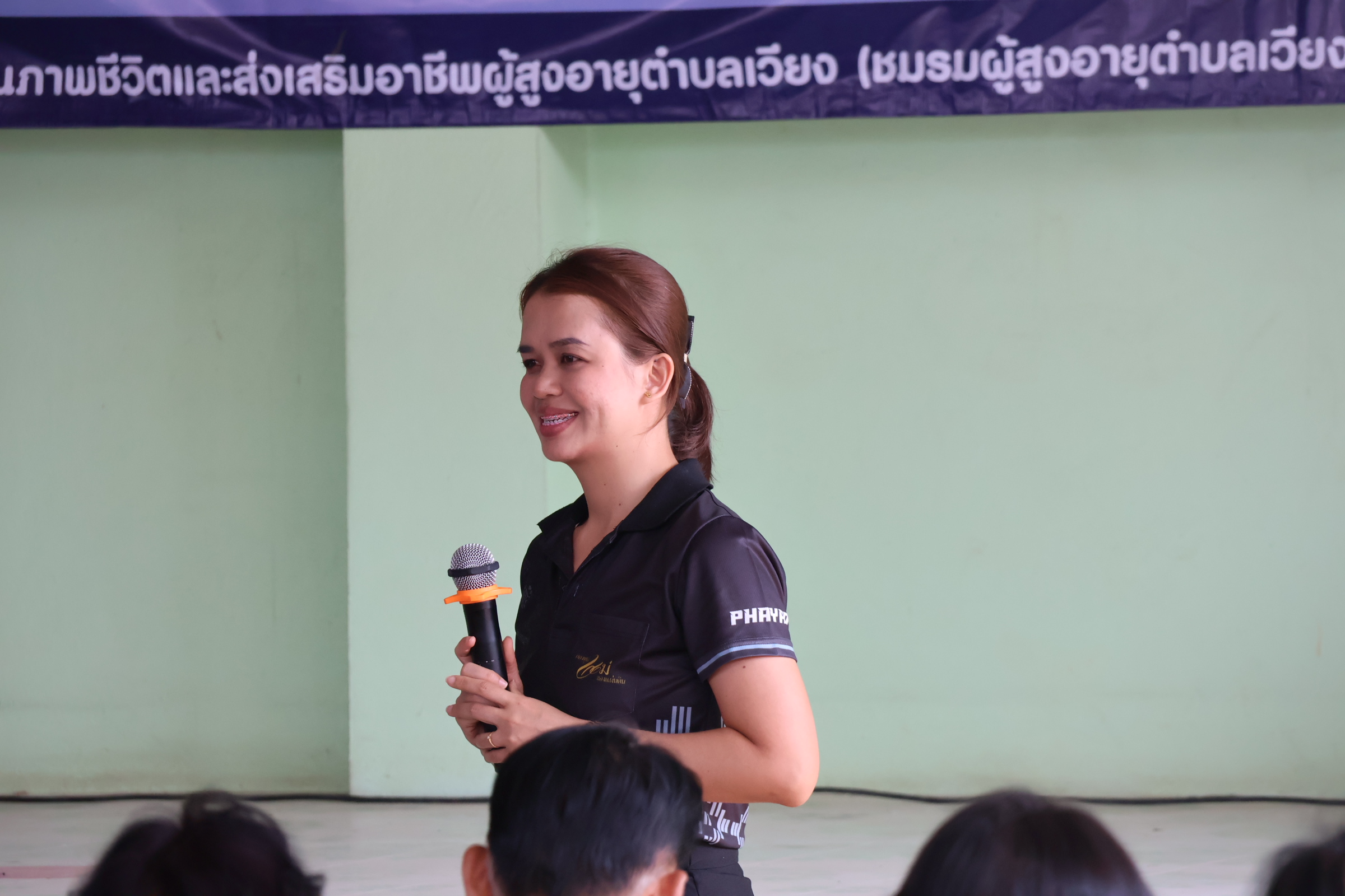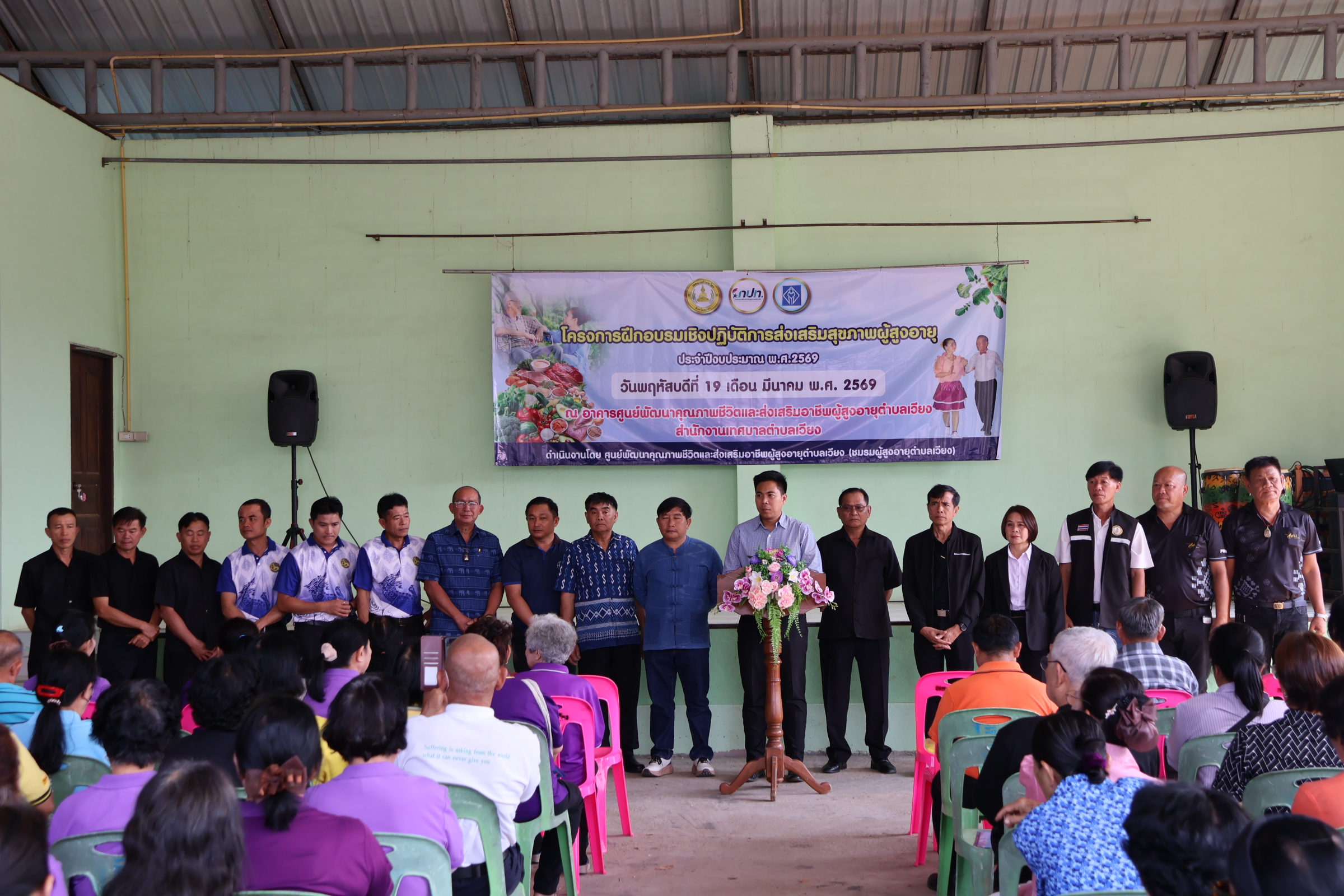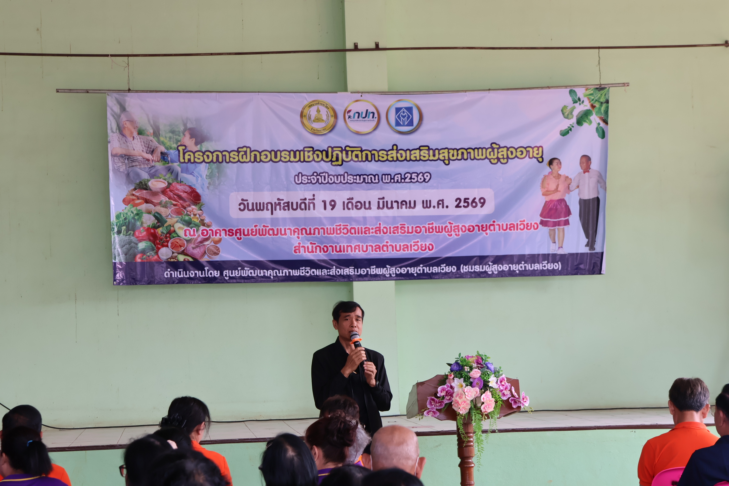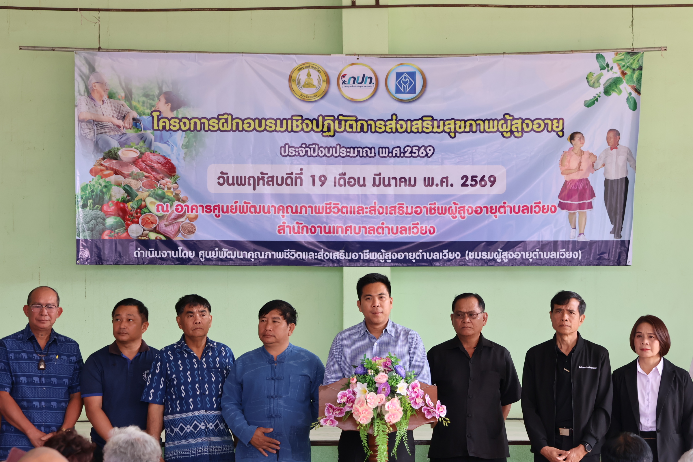 นายสุทธิพงษ์ วงศนันท์ นายกเทศมนตรีตำบลเวียง พร้อมด้วยคณะผู้บริหาร สมาชิกสภาเทศบาล ปลัดเทศบาล กำนัน ผู้ใหญ่บ้าน และกลุ่มแม่บ้านสตรี เข้าร่วมโครงการฝึกอบรมเชิงปฏิบัติการส่งเสริมสุขภาพผู้สูงอายุประจำปีงบประมาณ 2569