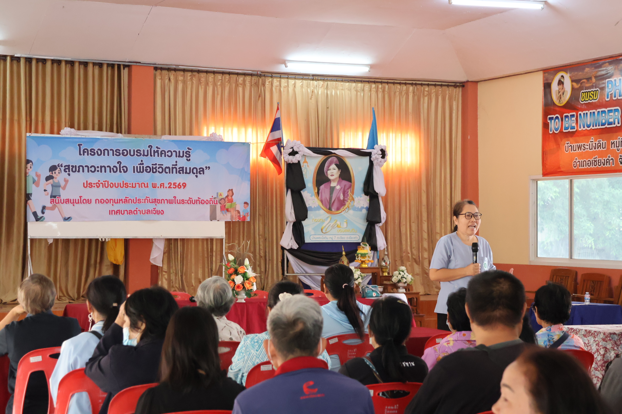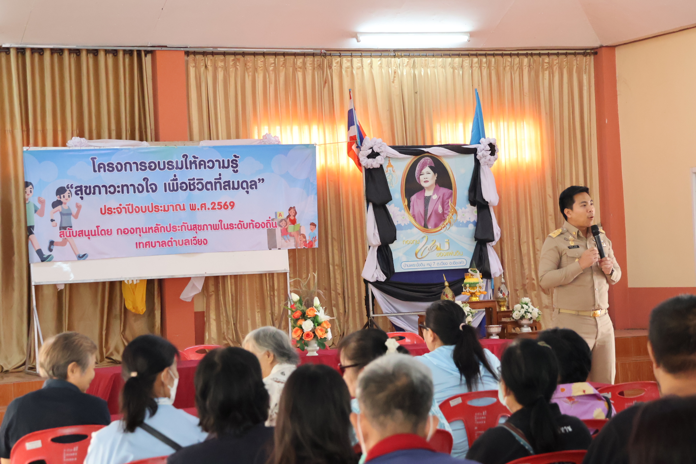 นายสุทธิพงษ์ วงศนันท์ นายกเทศมนตรีตำบลเวียง เป็นประธานในพิธีเปิดโครงการอบรมให้ความรู้ เรื่อง “สุขภาวะทางใจ เพื่อชีวิตสมดุล” เพื่อสร้างความรู้ความเข้าใจเกี่ยวกับความสำคัญของสุขภาพจิตและสัญญาณเตือนของปัญหาสุขภาพจิต ฝึกทักษะและเทคนิคการจัดการภาวะทางอารมณ์ และส่งเสริมให้เกิดการสร้างสภาพแวดล้อมที่เอื้อต่อการมีสุขภาพจิตดีในชุมชน ณ ศาลาเอนกประสงค์วัดพระนั่งดิน ตำบลเวียง อำเภอเชียงคำ จังหวัดพะเยา