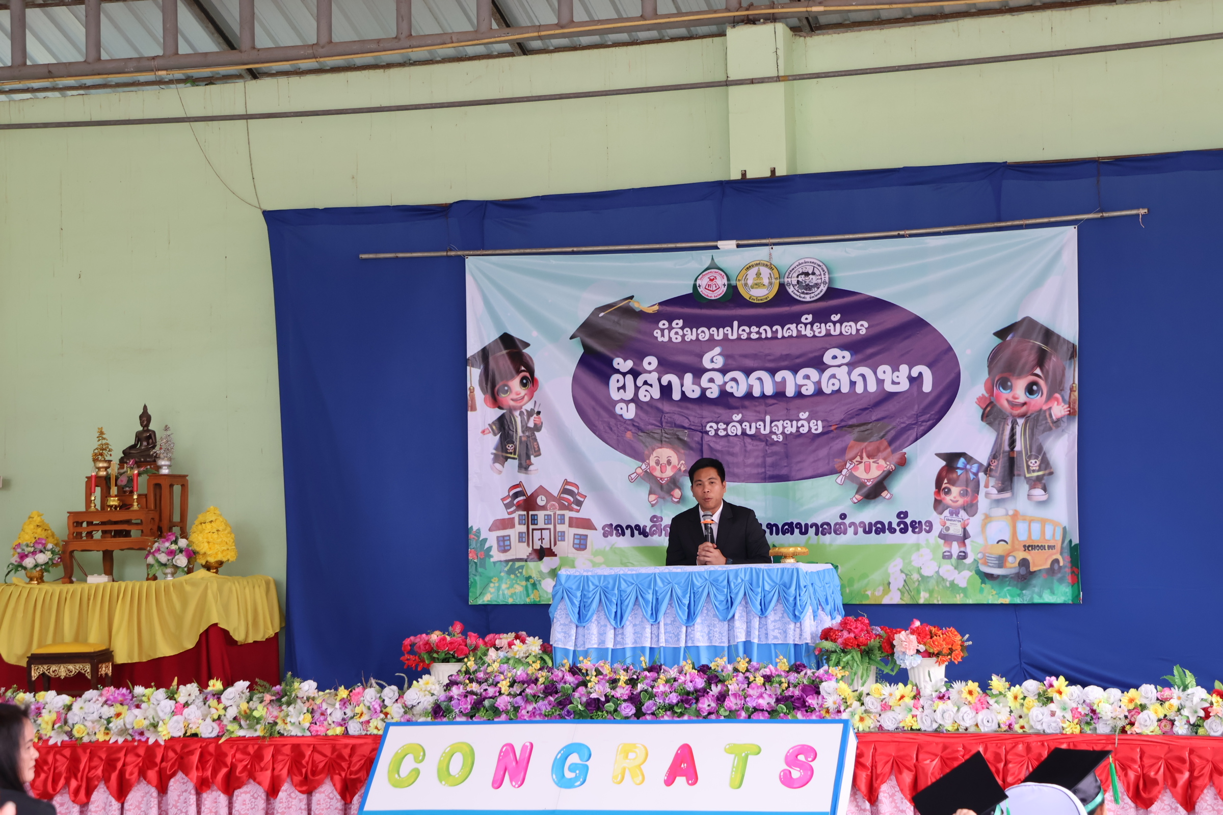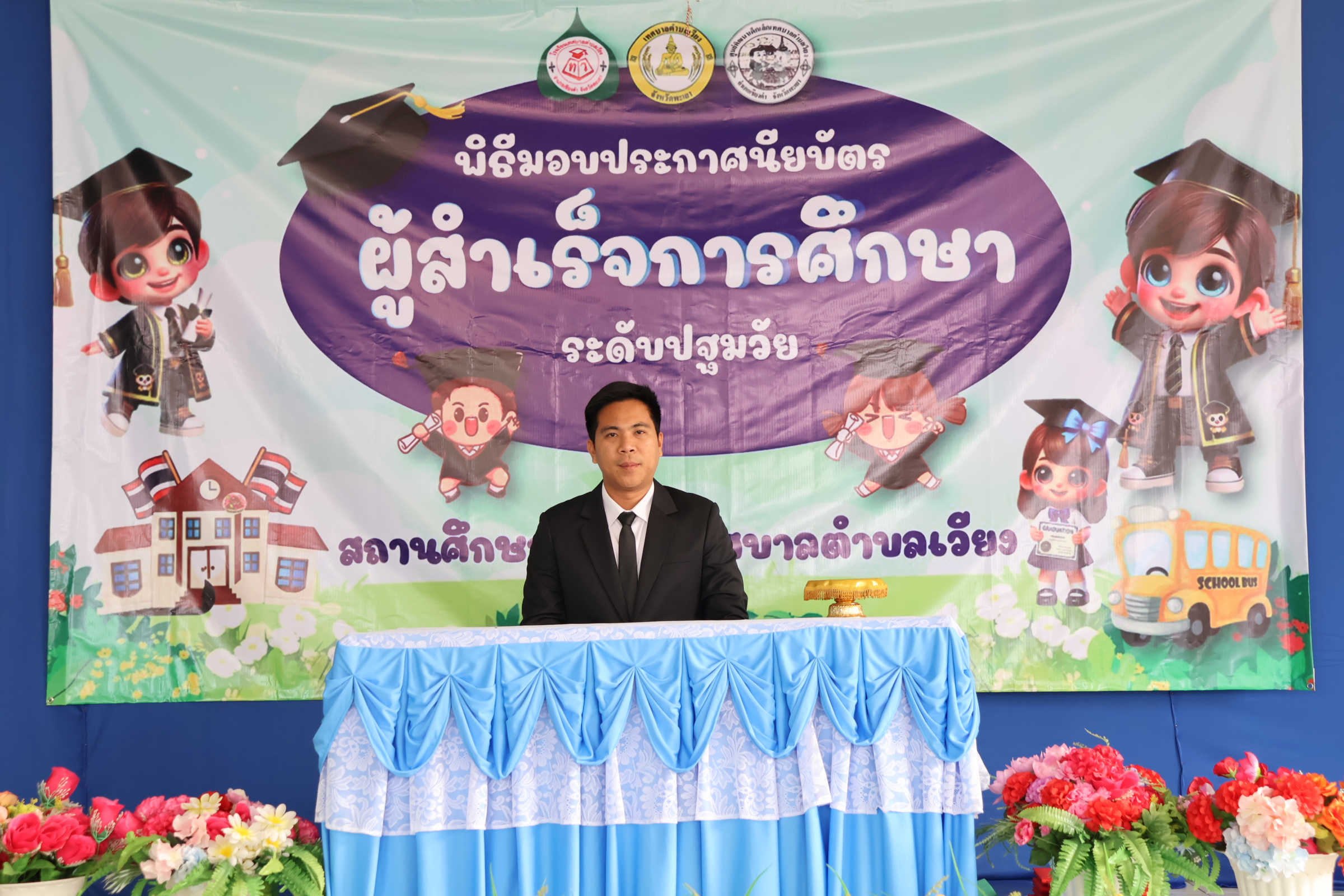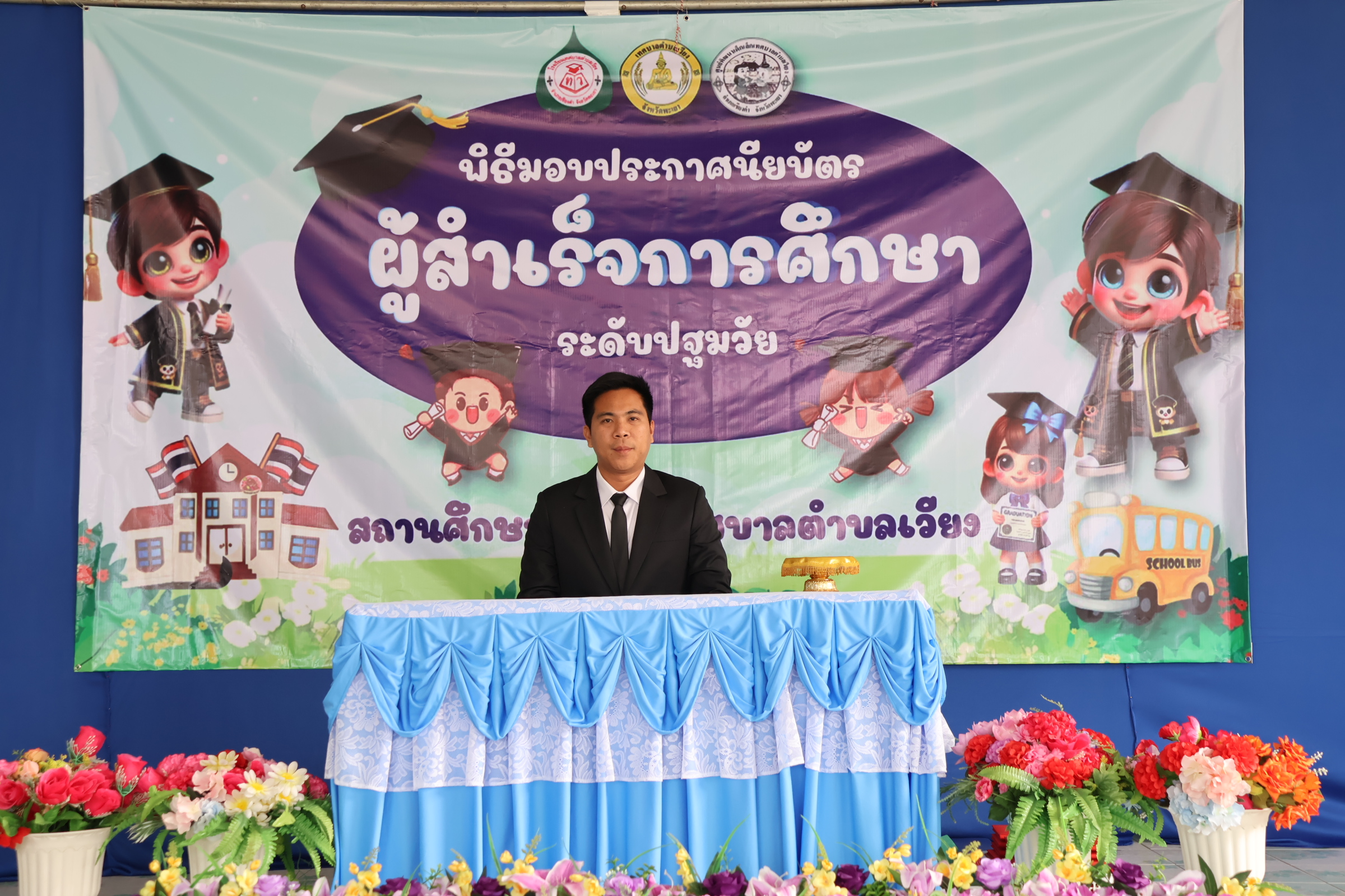 นายสุทธิพงษ์ วงศนันท์ นายกเทศมนตรีตำบลเวียง ประธานในพิธีเปิดโครงการมอบประกาศนียบัตรผู้สำเร็จการศึกษาระดับปฐมวัย ศูนย์พัฒนาเด็กเล็กและโรงเรียนเทศบาลตำบลเวียง ประจำปีการศึกษา 2568 จำนวน 27 คน พร้อมกล่าวให้โอวาทและแสดงความยินดีแก่บัณฑิตน้อยทุกคน โดยมีวัตถุประสงค์เพื่อแสดงความยินดีในความสำเร็จ ของนักเรียน และเป็นการสร้างขวัญกำลังใจให้กับนักเรียน ในการก้าวสู่รั้วสถาบันการศึกษาต่อไปอย่างภาคภูมิ อีกทั้งเป็นการสร้างความสัมพันธ์อันดีระหว่างผู้บริหาร ครู นักเรียน และผู้ปกครอง