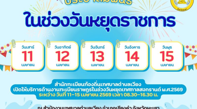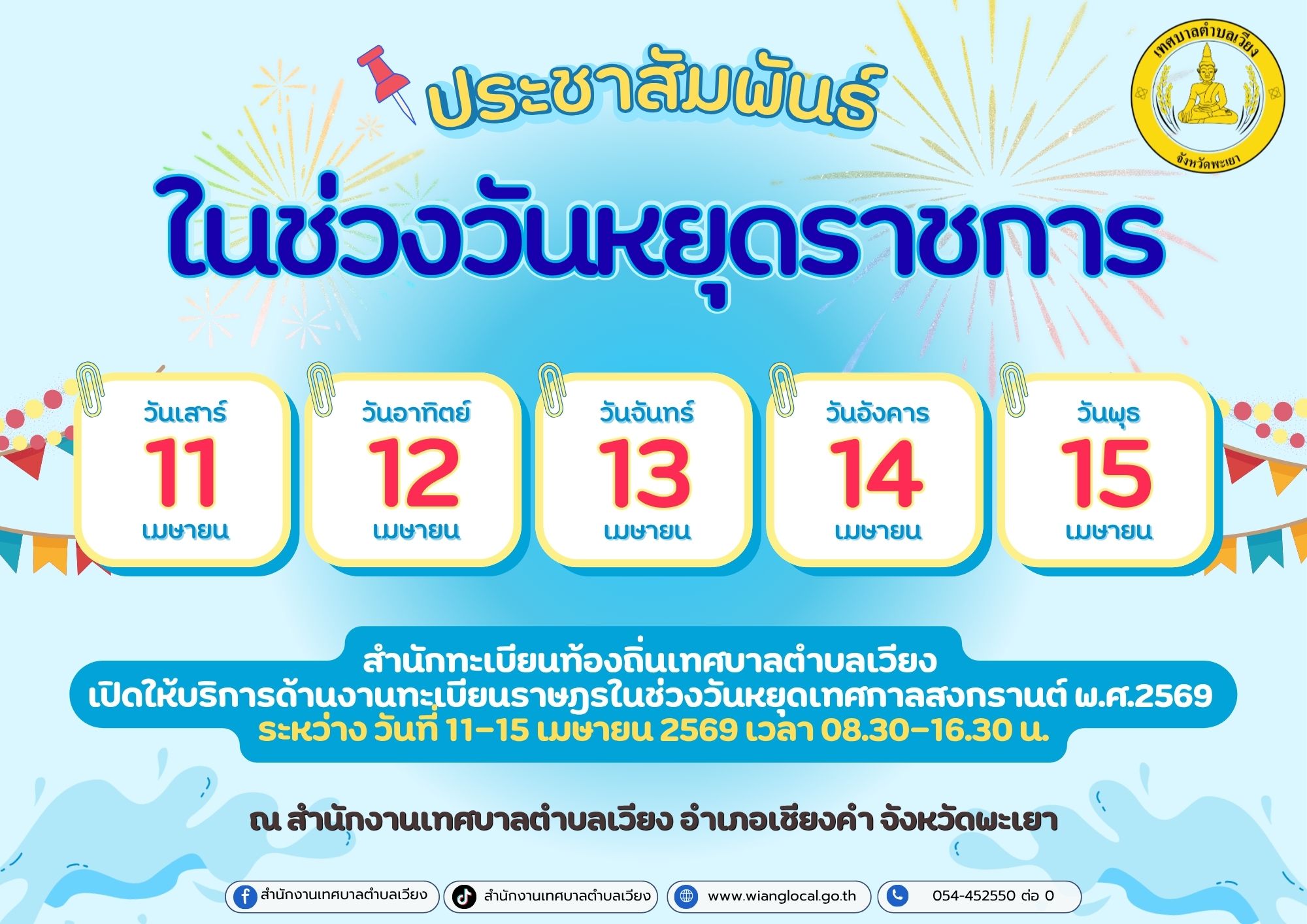 สำนักทะเบียนท้องถิ่นเทศบาลตำบลเวียง เปิดให้บริการด้านงานทะเบียนราษฎรในช่วงวันหยุดเทศกาลสงกรานต์ พ.ศ.2569 ระหว่าง วันที่ 11-15 เมษายน 2569 เวลา 08.30-16.30 น.