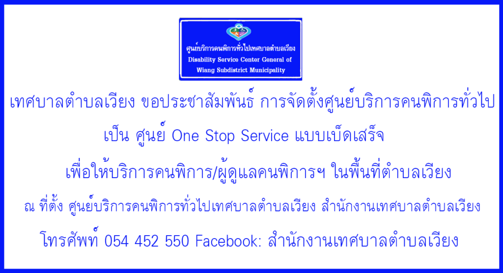 ข่าวประชาสัมพันธ์ ประชาสัมพันธ์ การจัดตั้งศูนย์บริการคนพิการทั่วไปเทศบาลตำบลเวียง 25 กรกฎาคม 256520 มิถุนายน 2023 wianglocal ประชาสัมพันธ์ การจัดตั้งศูนย์บริการคนพิการทั่วไปเทศบาลตำบลเวียง