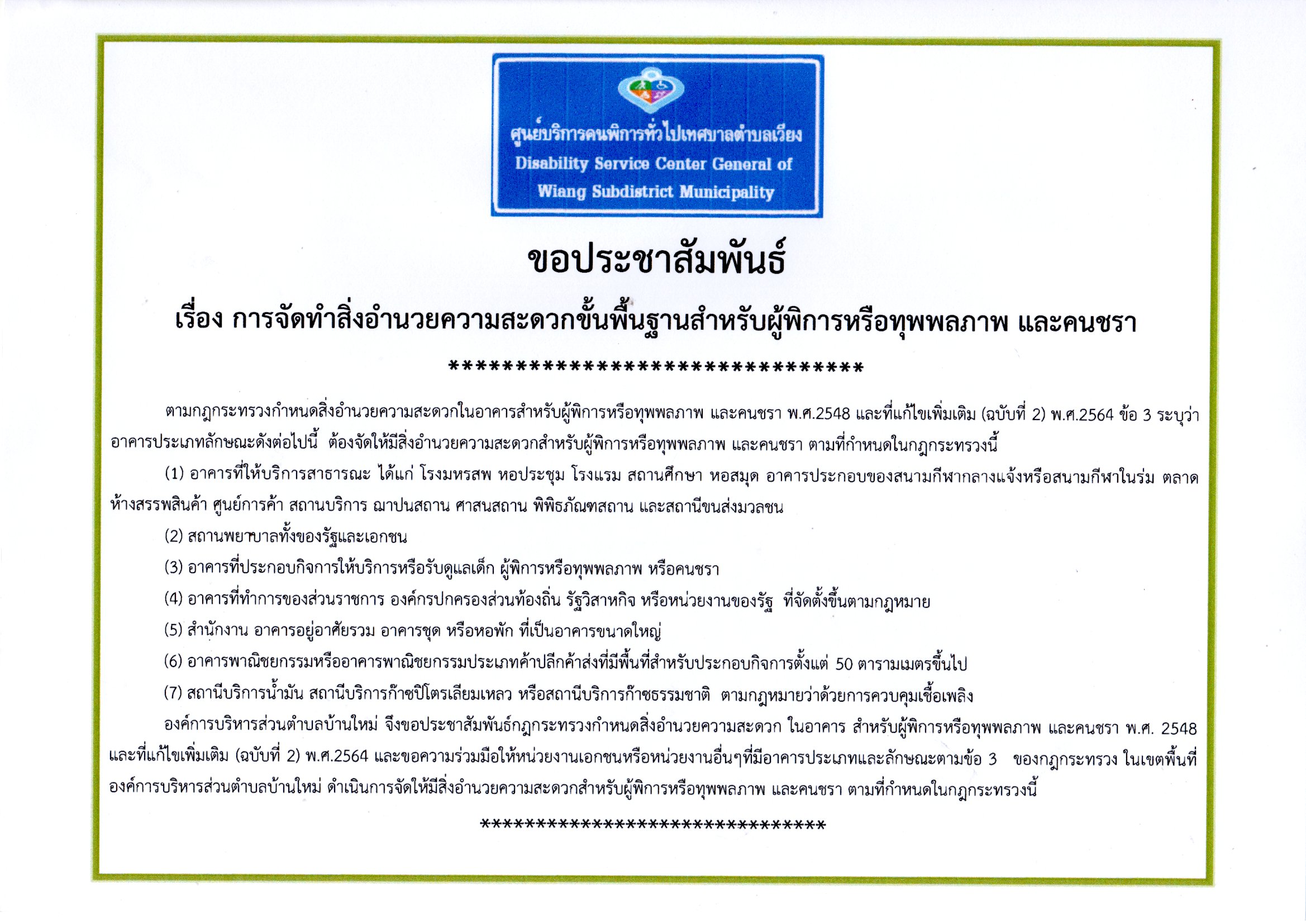 ขอประชาสัมพันธ์และเชิญชวน หน่วยงานเอกชนและภาครัฐในพื้นที่ เรื่อง การจัดทำสิ่งอำนวยความสะดวกขั้นพิื้นฐานสำหรับผู้พิการหรือทุพภาพและคนชรา