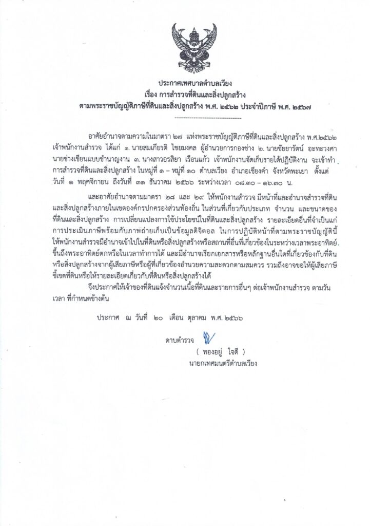 ข่าวประกาศ ข่าวประชาสัมพันธ์ การสำรวจที่ดินและสิ่งปลูกสร้างตามพระราชบัญญัติภาษีที่ดินและสิ่งปลูกสร้าง พ.ศ. 2562 ประจำปี พ.ศ. 2567 ในเขตเทศบาลตำบลเวียง ระหว่างเดือนพฤศจิกายน – เดือนธันวาคม 2566 27 ตุลาคม 256627 ตุลาคม 2023 ธัญญาพร ฟ้าเลิศ