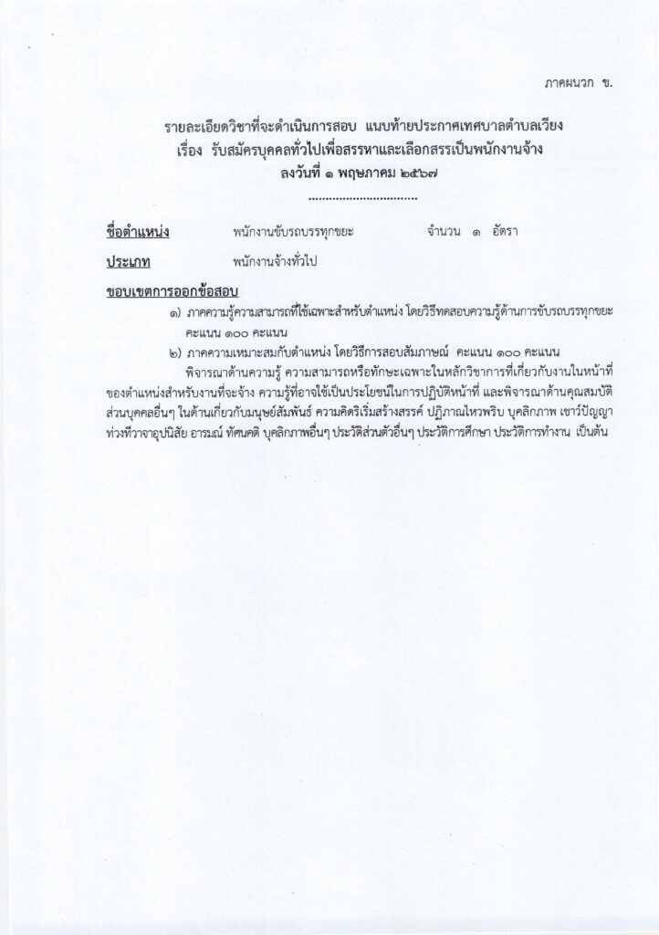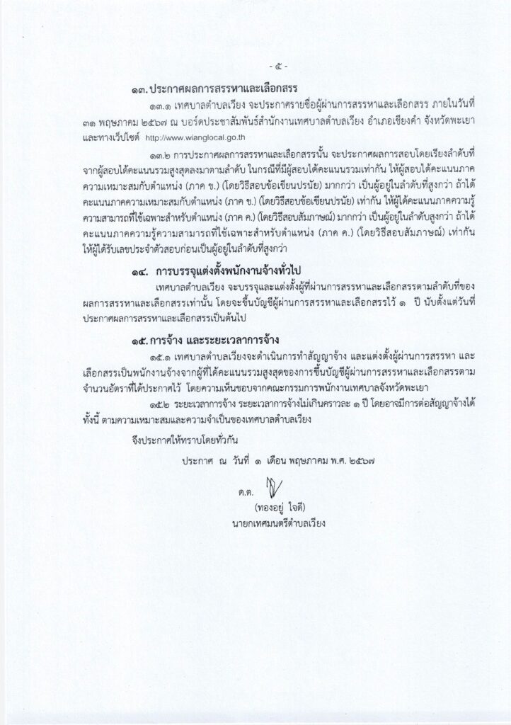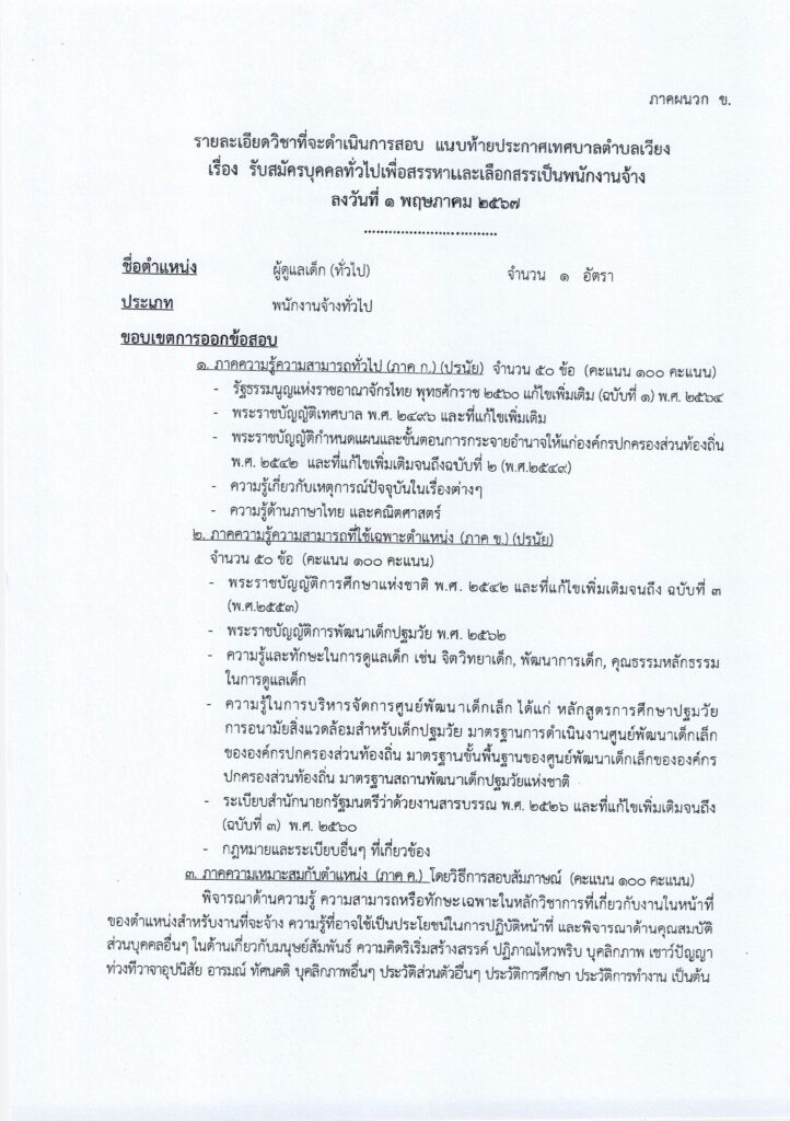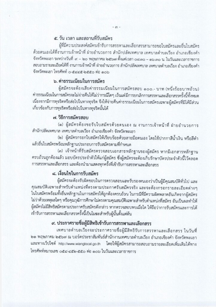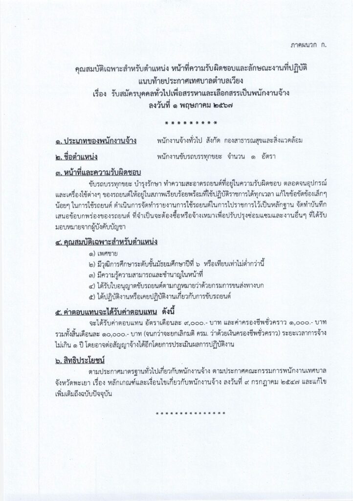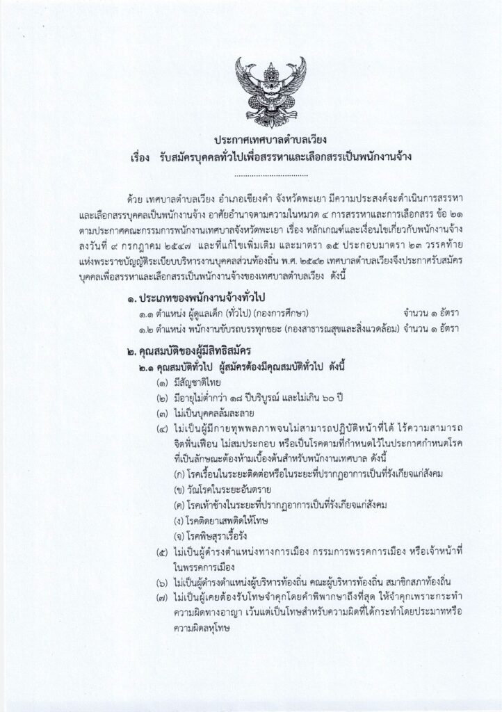 วันที่ 1 พฤษภาคม 2567 เทศบาลตำบลเวียง อำเภอเชียงคำ จังหวัดพะเยา มีความประสงค์จะดำเนินการสรรหา และเลือกสรรบุคคลเป็นพนักงานจ้าง อาศัยอำนาจตามความในหมวด 4 การสรรหาและการเลือกสรร ข้อ 21 ตามประกาศคณะกรรมการพนักงานเทศบาลจังหวัดพะเยา เรื่อง หลักเกณฑ์และเงื่อนไขเกี่ยวกับพนักงานจ้าง ลงวันที่ ๙ กรกฎาคม ๒๕๔๗ และที่แก้ไขเพิ่มเติม และมาตรา 15 ประกอบมาตรา 23 วรรคท้าย แห่งพระราชบัญญัติระเบียบบริหารงานบุคคลส่วนท้องถิ่น พ.ศ. 2542 เทศบาลตำบลเวียงจึงประกาศรับสมัครบุคคลเพื่อสรรหาและเลือกสรรเป็นพนักงานจ้างของเทศบาลตำบลเวียง รายละเอียดปรากฎตามสิ่งที่แนบมาด้วย