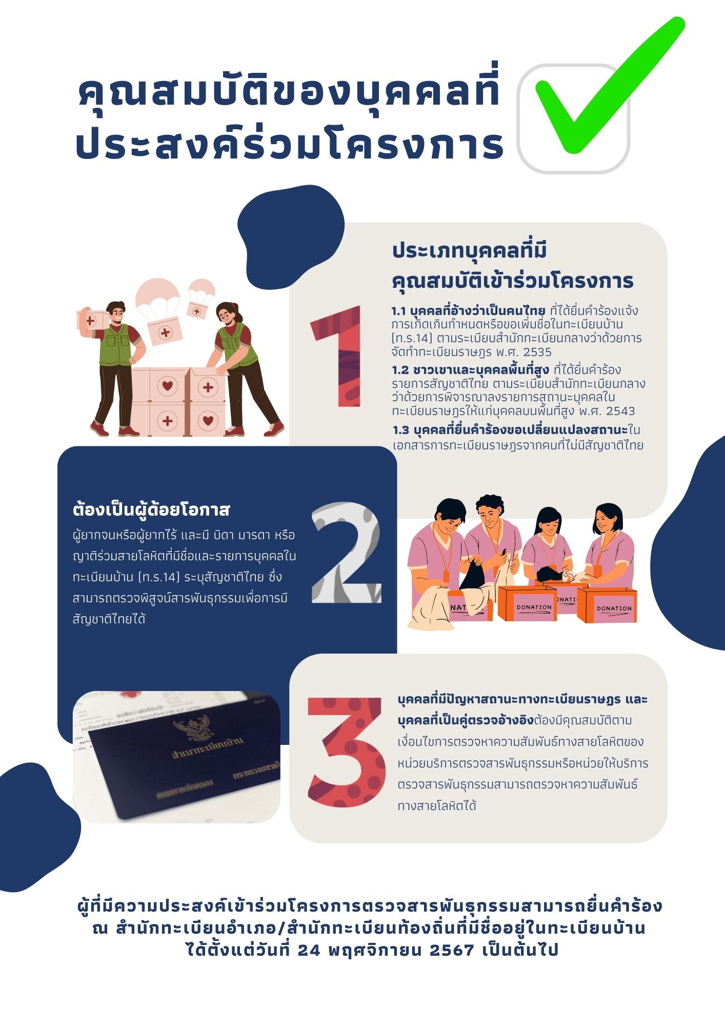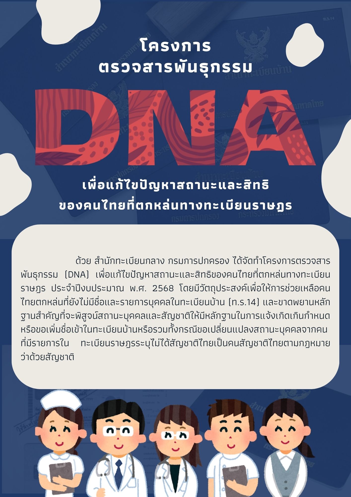 ประชาสัมพันธ์ โครงการตรวจสารพันธุกรรม (DNA) เพื่อแก้ไขปัญหาสถานะและสิทธิของคนไทยที่ตกหล่นทางทะเบียนราษฎร ประจำปีงบประมาณ 2568