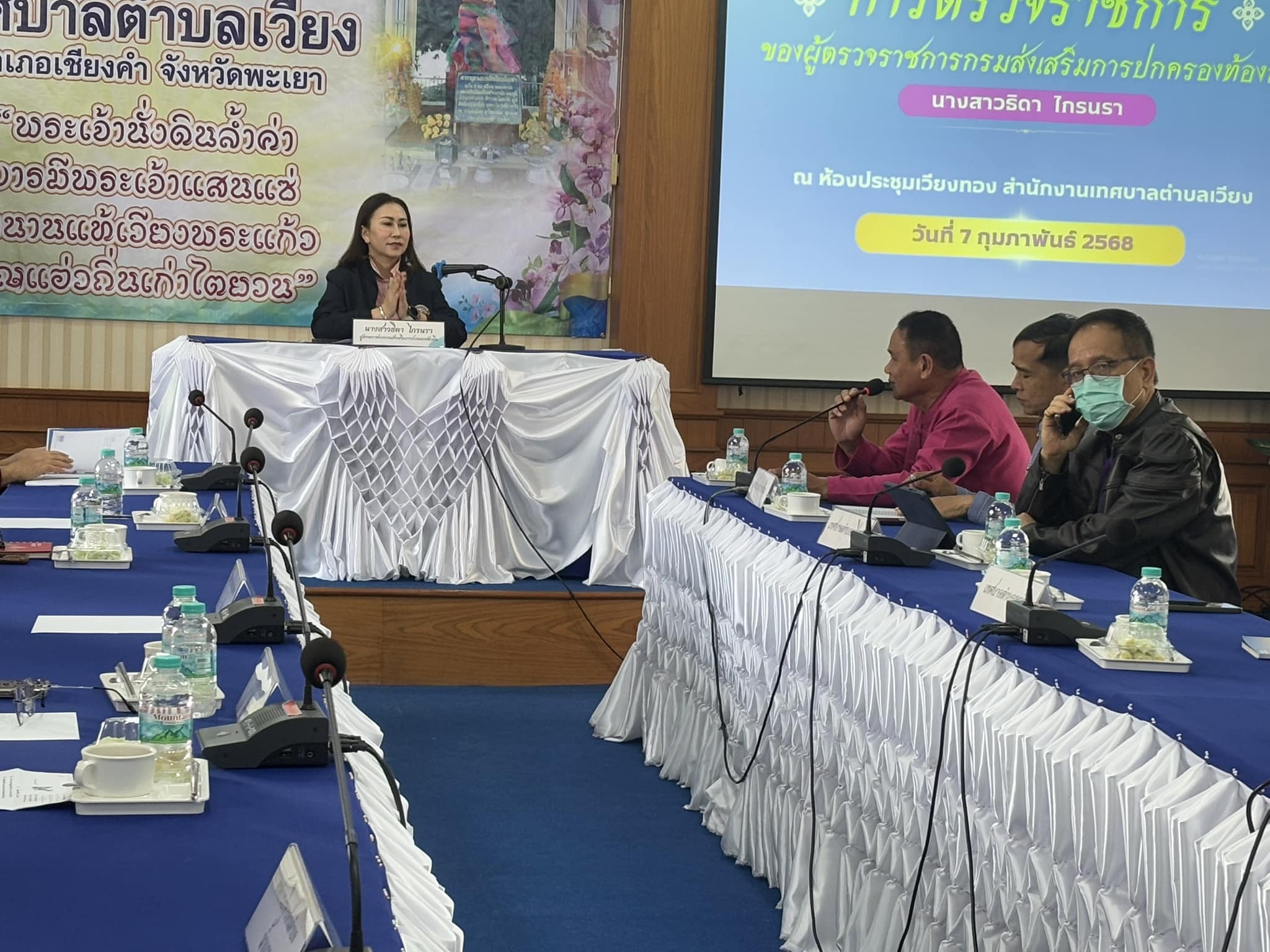 นางสาวธิดา ไกรนรา ผู้ตรวจราชการกรมส่งเสริมการปกครองท้องถิ่น ลงพื้นที่อำเภอเชียงคำ จังหวัดพะเยา ติดตามการขับเคลื่อนภารกิจสำคัญตามนโยบายของรัฐบาล กระทรวงมหาดไทย และกรมส่งเสริมการปกครองท้องถิ่น โดยมี