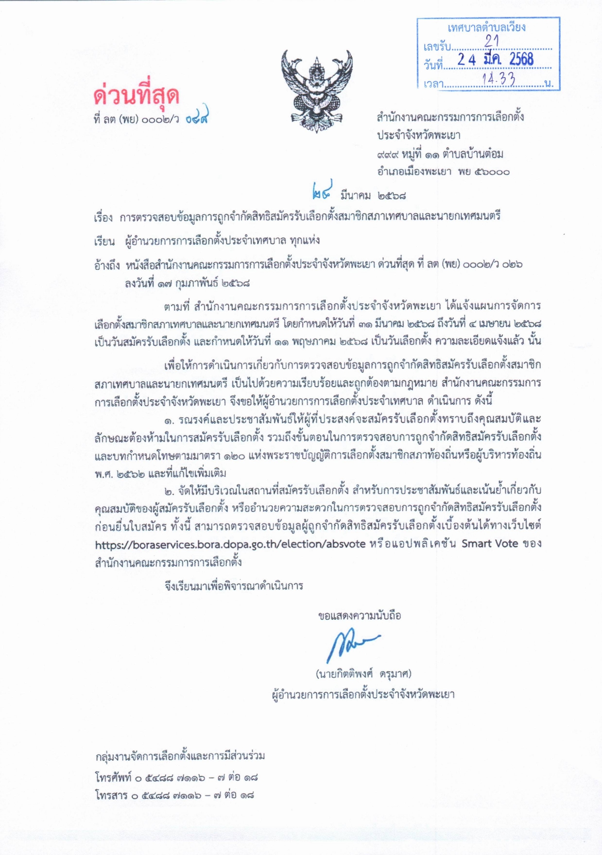 ประชาสัมพันธ์ เรื่อง การตรวจสอบข้อมูลการถูกจำกัดสิทธิสมัครเลือกตั้งสมาชิกสภาเทศบาลและนายกเทศมนตรี
