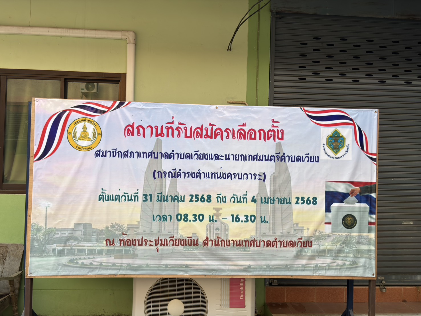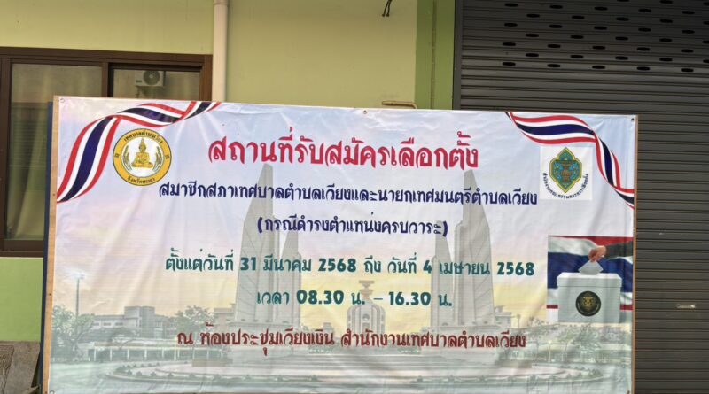 ข่าวประชาสัมพันธ์ การสมัครรับเลือกตั้งสมาชิกสภาเทศบาลตำบลเวียงและนายกเทศมนตรีตำบลเวียง 31 มีนาคม 256831 มีนาคม 2025 wianglocal วันจันทร์ที่ 31 มีนาคม 2568 ศูนย์ประสานงานการเลือกตั้งประจำเทศบาลตำบลเวียง รับสมัครรับเลือกตั้งสมาชิกสภาเทศบาลตำบลเวียงและนายกเทศมนตรีตำบลเวียง เป็นวันแรก โดยรับสมัครตั้งแต่วันที่ 31 มีนาคม 2568 ถึง วันที่ 4 เมษายน 2568 ตั้งแต่เวลา 08.30 น. – 16.30 น.