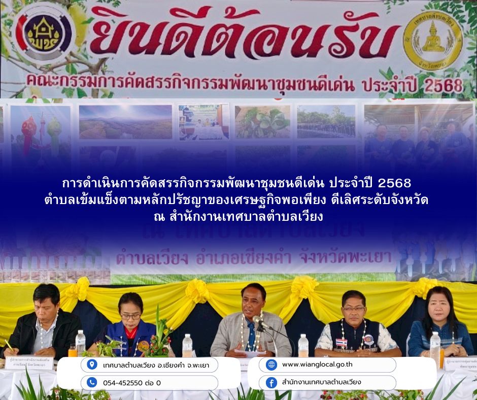 การดำเนินการคัดสรรกิจกรรมพัฒนาชุมชนดีเด่น ประจำปี 2568 ตำบลเข้มแข็งตามหลักปรัชญาของเศรษฐกิจพอเพียง ดีเลิศระดับจังหวัด ณ สำนักงานเทศบาลตำบลเวียง