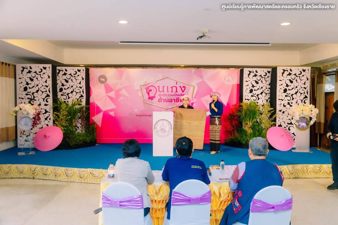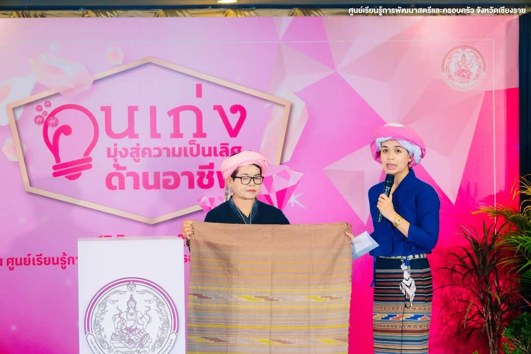 การประกวด เวทีคนเก่งมุ่งสู่ความเป็นเลิศด้านอาชีพ ประเภท “ผลิตภัณฑ์เด่น” ผ้าทอลายน้ำไหล กลุ่มผ้าทอไทลื้อบ้านล้า ตำบลเวียง อำเภอเชียงคำ จังหวัดพะเยา