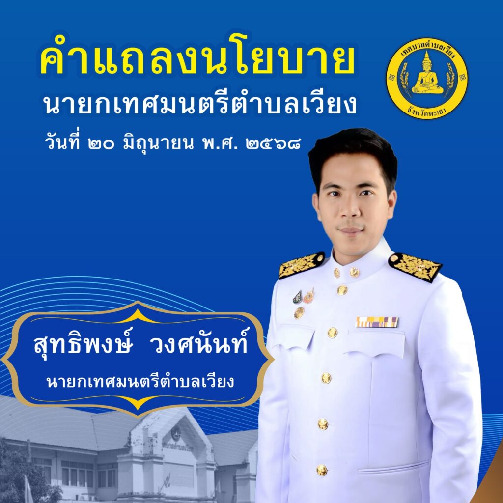 ในวันนี้ที่ประชุมได้ร่วมรับฟังการแถลงนโยบายของนายสุทธิพงษ์ วงศนันท์ นายกเทศมนตรีตำบลเวียง ต่อสภาเทศบาลตำบลเวียง ได้กำหนดนโยบายแบ่งออกเป็น 7 ด้าน ดังนี้