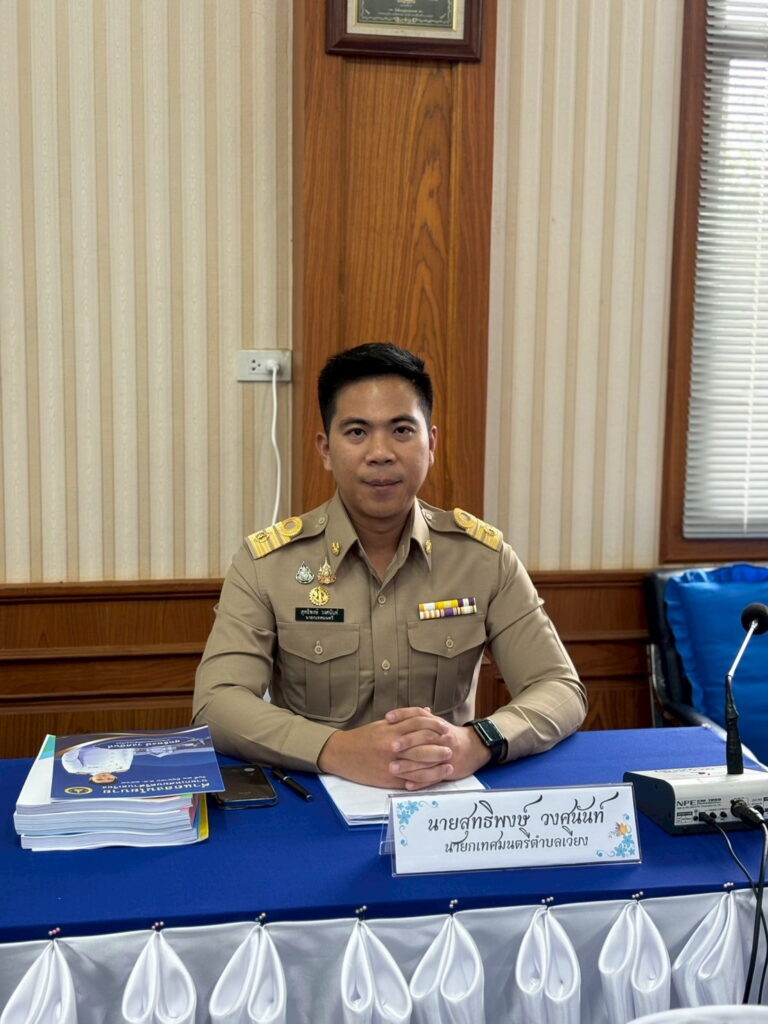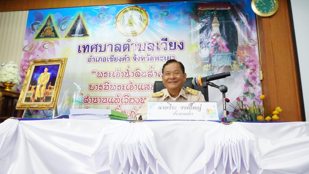 นายสุทธิพงษ์ วงศนันท์ นายกเทศมนตรีตำบลเวียง แถลงนโยบายต่อสภาในการประชุมสภาเทศบาลตำบลเวียง