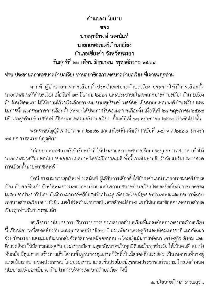 ข่าวกิจกรรม คำแถลงนโยบาย นายกเทศมนตรีตำบลเวียง วันที่ 20 มิถุนายน พ.ศ. 2568 7 กรกฎาคม 25687 กรกฎาคม 2025 ชนินทร ธรรมศิลป์ คำแถลงนโยบาย นายกเทศมนตรีตำบลเวียง วันที่ 20 มิถุนายน พ.ศ. 2568