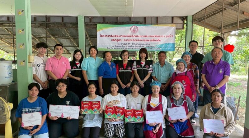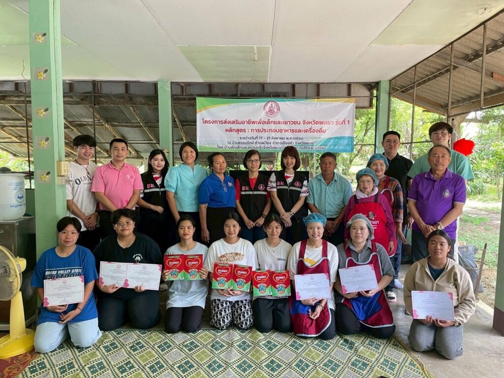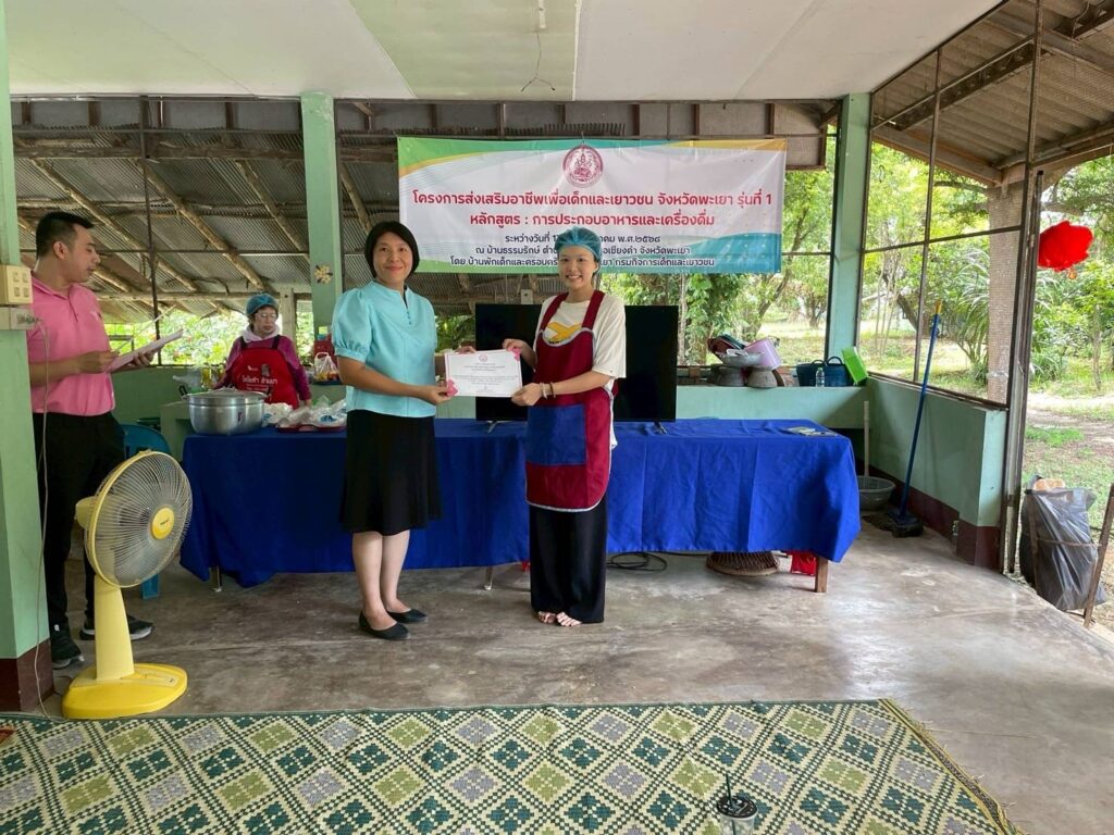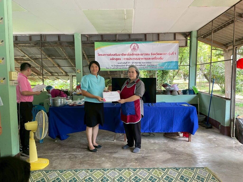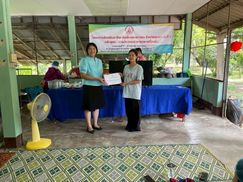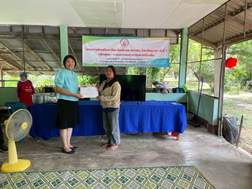 มอบเกียรติบัตรให้เด็กและเยาวชนที่เข้าร่วมโครงการเสริมสร้างทักษะอาชีพเพื่อเด็กและเยาวชนจังหวัดพะเยา รุ่นที่ 1 ณ บ้านธรรมรักษ์ ตำบลเวียง อำเภอเชียงคำ จังหวัดพะเยา